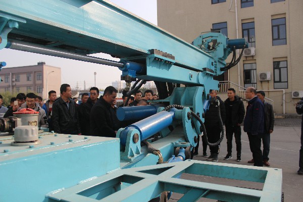 首先,二一六大隊一行現場參觀了新產品HXY-1600型智能拖車鉆機組及NCT-10泥漿不落地裝置,張總對拖車機組和泥漿不落地設備特點及性能進行了介紹。隨后由專業人員對功能進行了操作演示。